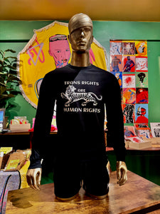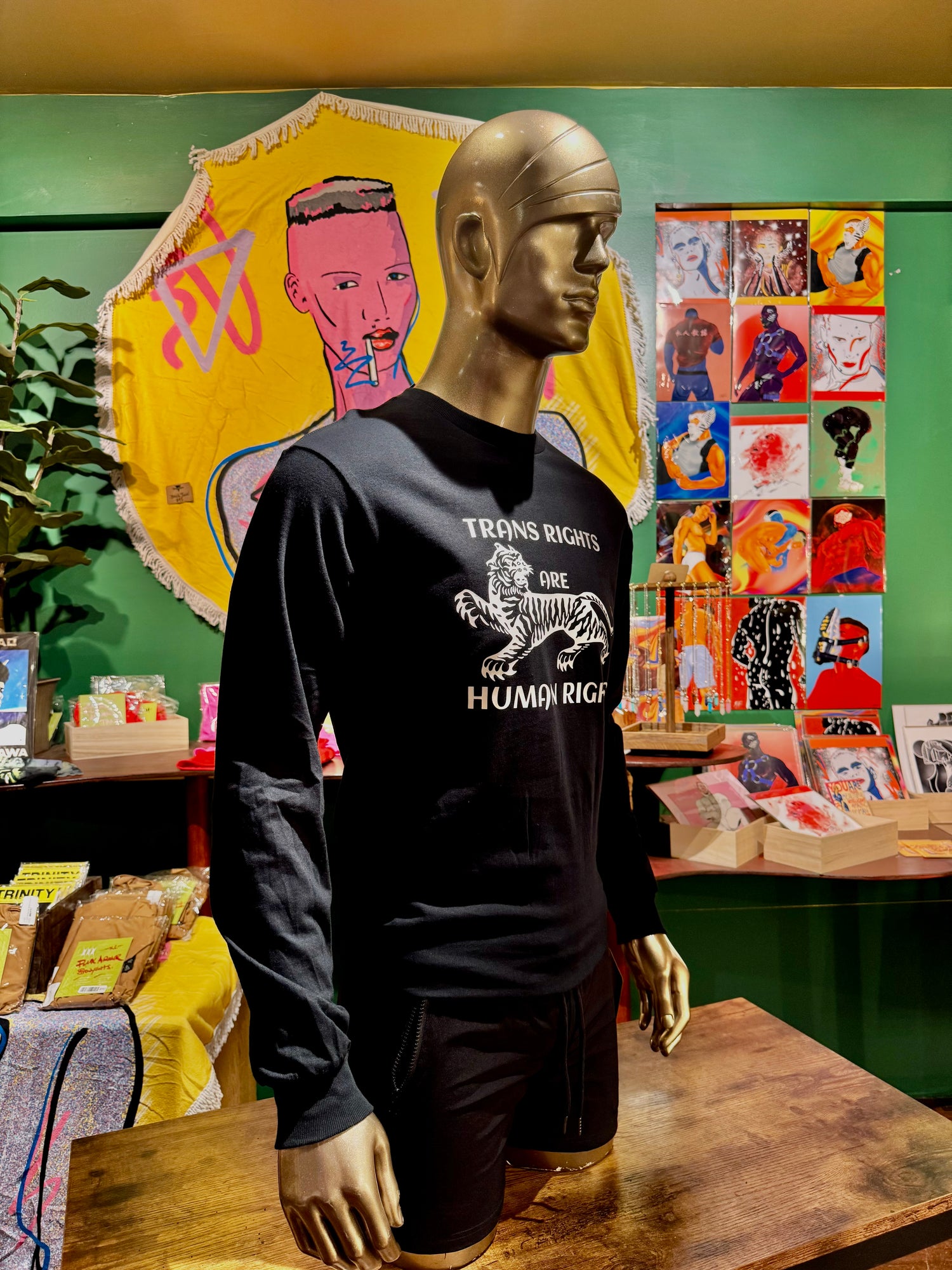 Black long sleeve t-shirt with white lettering and decal of fierce tiger.